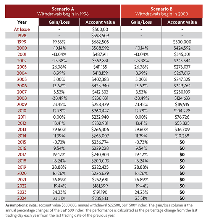 Also known as sequence risk, this refers to the risk of adverse market returns that can occur late in a person’s working years or during the early years of retirement. Suppose a market downturn happens during this period. In that case, it can potentially have a large impact on retirement savings and an overall financial portfolio since there is less time to recover from those losses. Let’s explore a hypothetical example of sequence of returns risk. In the two hypothetical examples provided, scenario A begins taking withdrawals in 1998, and scenario B begins taking withdrawals just two years later in 2000.1 Both have $500,000 at the time withdrawals begin. Twenty-one years later, with just a difference of two years from when withdrawals started, scenario A still has over $100,000, while scenario B’s account is depleted by year 15. For those looking to help mitigate the risk of potentially outliving retirement savings, a fixed index annuity (FIA) might be an option.